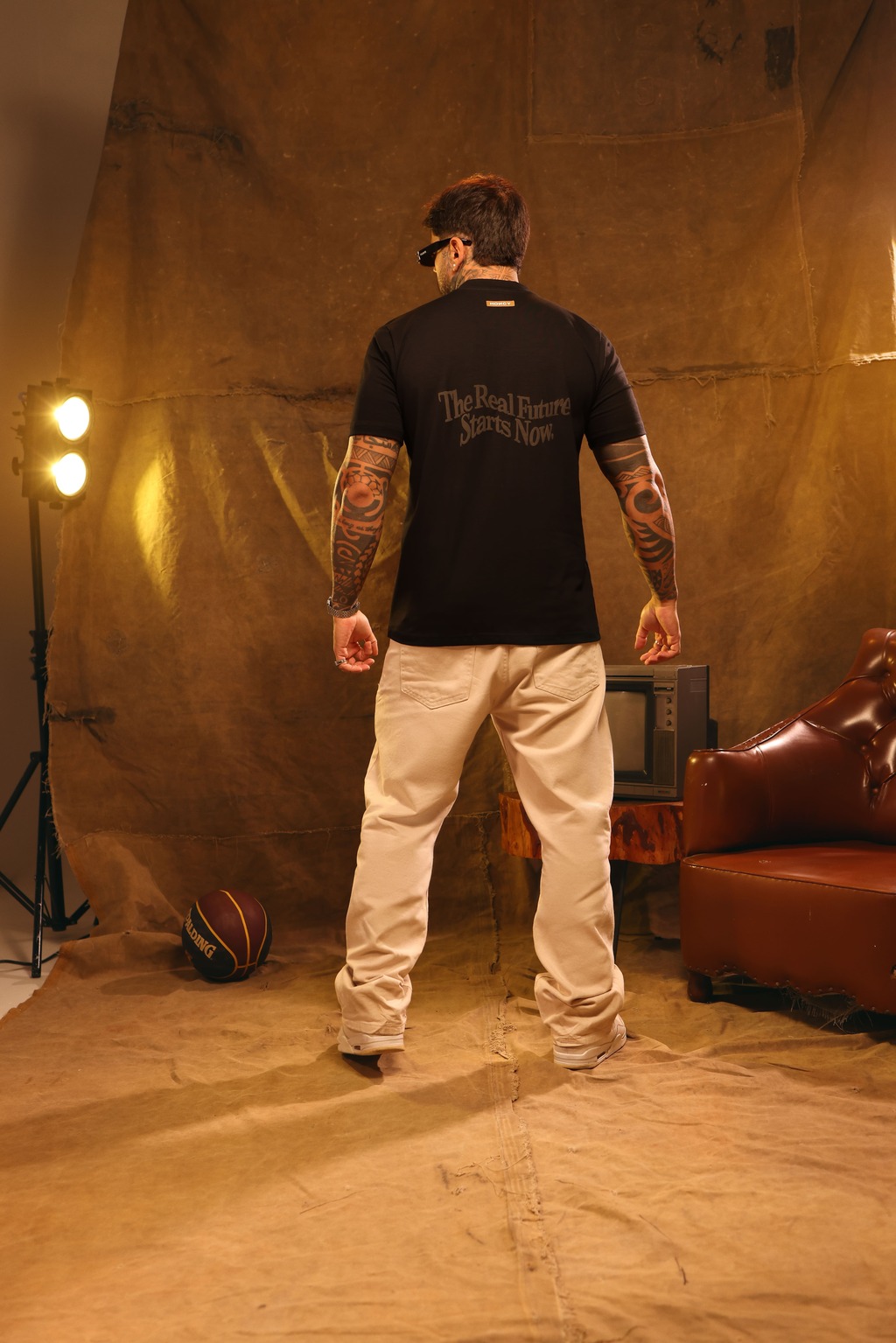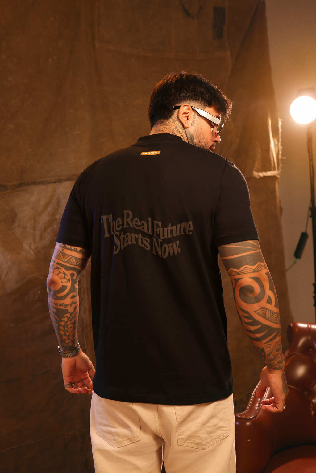 Tshirt slim na cor preta, a peça possui o nome da marca em puff na cor preta na frente e na parte de trás a frase "The Real Future Starts Now" na cor preta com a estampa em puff.